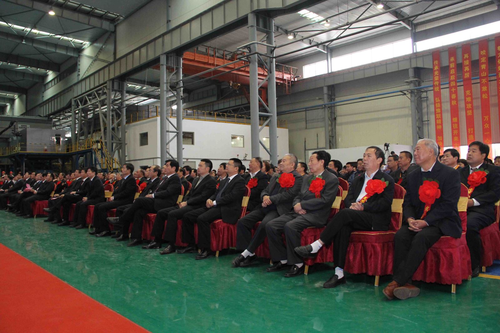 在煥然一新的高精鋁冷軋車間門前,100余家合作單位的祝賀條幅垂直懸掛在廠房前方,代表著社會各界的良好祝愿。慶典大會現場喜慶熱烈,“誠信為本,一體雙翼,譜四十華章員工安居樂業;創新發展,轉型升級,追百年夢想豫聯基業長青”的大幅對聯熠熠生輝。