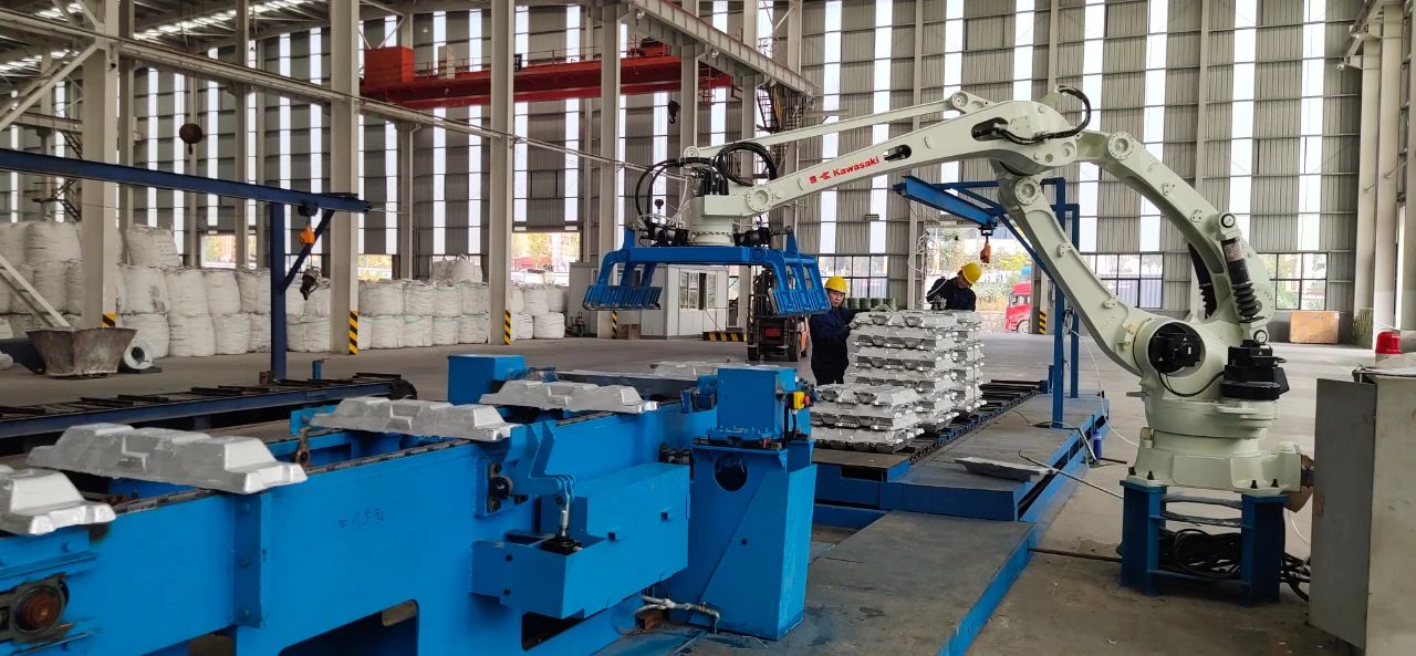 經(jīng)過考察和反復(fù)研討,廣元中孚項目部確定了升級改造方案,科學(xué)進行生產(chǎn)調(diào)度。設(shè)備到場后,技術(shù)骨干全力配合廠家進行改造,僅用一周時間就完成了1號鑄錠線的改造工作。目前,1號鑄錠線鏈式輸送機、冷運機運行平穩(wěn),嶄新的機械手取代了原來的液壓碼垛機,有條不紊地抓放著銀白色的鋁錠。