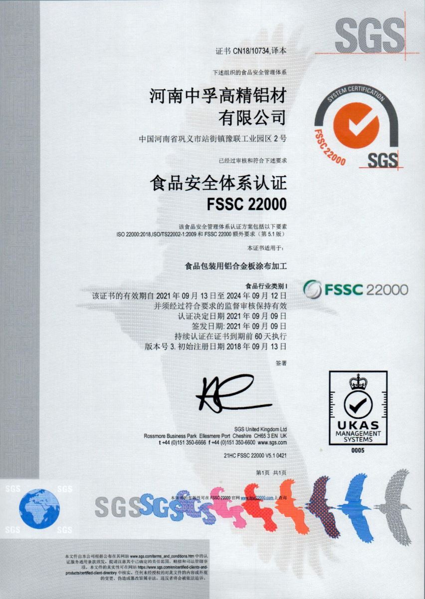 近日,中孚高精鋁材公司順利完成了FSSC22000食品安全管理體系第三方認證換版工作,獲得了新證書。